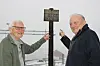 PÅ PLASS: – Bane NOR har sørget for at grenseskiltet har fått plass på stasjonsområdet. Takk for det, sier Vemund Lindgren og Olav Leikvoll. Under dette skiltet kommer et skilt som viser den første billetten, kjøpt på Lunde stasjon.