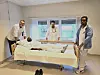 MANNLIGE HELSEARBEIDERE: Stian, Tobias og Yemane er samlet rundt «pasienten» Adam. Alle er de ansatte helsearbeidere ved Nome sjukeheim.