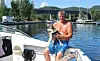 HELT TOPP: Leif Helge Olsen, bosatt i Svelvik, har akkurat tatt en dukkert i Norsjø. Sammen med hunden venter han i båten ved gjestebrygga mens kona er en tur på tur på biblioteket.- Dette er er Norge på sitt beste, fastslår han.