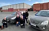 GJENGEN BAK INNSAMLINGEN: Initiativtakerne bak «Sammen for Ukraina» viser frem to av bilene som skal doneres til frontlinjen i Ukraina. Her med Ola, Igor, Dag Jarle, Kristian, Anastasia og Kateryna