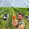For to år siden sto anlegget for dyrkning av jordbær i ranker, én meter over bakken, klart. Bærene er av en ny sort som heter «Murano», som er ideell for denne typen dyrkning og som blomstrer hele sommeren.