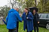 TØFFE SPØRSMÅL: Her tar regiongeolog, Sven Dahlgren, imot næringsminister Cecilie Myrseth ved Holla kirkeruin. Senere på dagen måtte ministeren tåle noen tøffe spørsmål fra geologen, om regjeringens satsing på mineralindustrien.