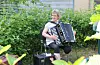 I sommervarmen sitter beboere og ansatte ved Nome Sjukeheim samlet rundt trekkspiller Eva Marie Bjerklund.