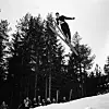 SVEV: En hopper fra Hantobakken i et luftig svev i et av hopprennene etter andre verdenskrig.